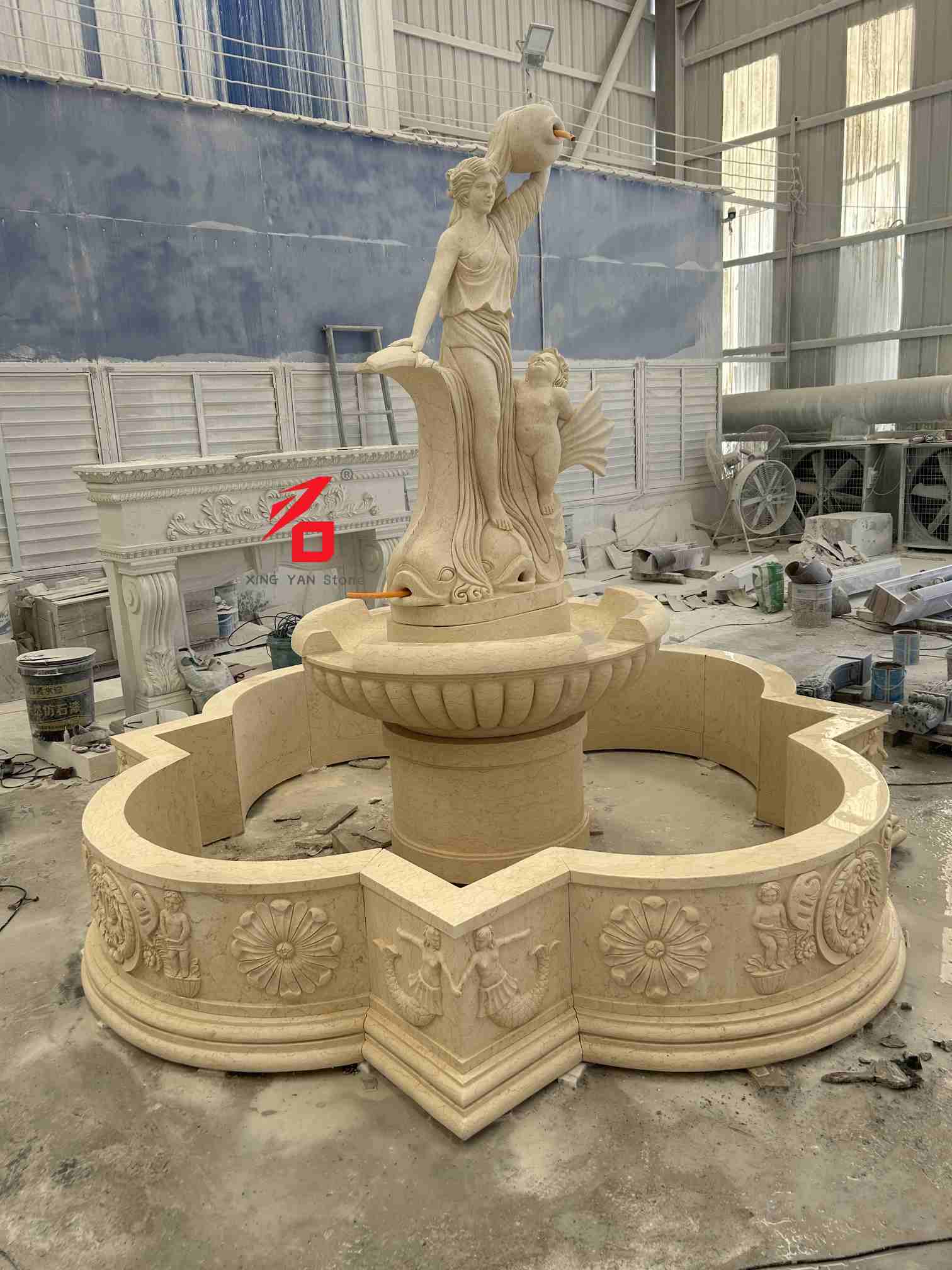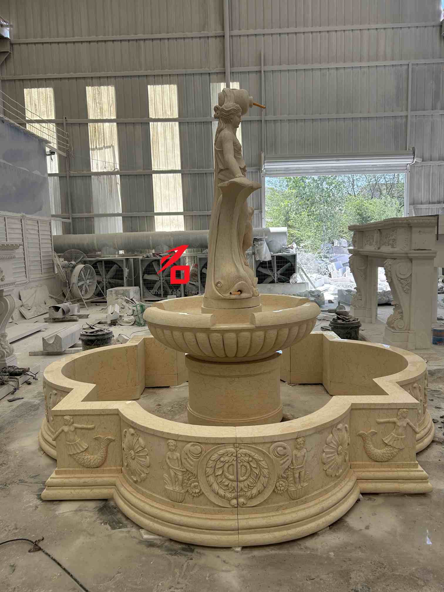 दगड पर्याय: सानुकूल दगड पर्यायांमध्ये बेज संगमरवरी, पांढरा संगमरवरी, वाळूचा खडक आणि इतर नैसर्गिक दगडांचा समावेश आहे. दगडाचा उत्तम पोत, उबदार रंग आणि मजबूत हवामानाचा प्रतिकार यामुळे कारंजाची टिकाऊपणा आणि दीर्घकालीन बाह्य वापरासाठी सौंदर्याचा आकर्षण सुनिश्चित होतो. कोरीव कारागिरी: पारंपारिक हस्त-कोरीव तंत्राचा वापर करून, अनुभवी शिल्पकार देवीच्या चेहऱ्यावरील हावभाव आणि ड्रेपरीपासून लहान मुलांपर्यंत आणि माशांच्या आकाराचे दागिने, युरोपियन शास्त्रीय शिल्पकलेची कलात्मक पोत आणि त्रिमितीयता दर्शविणारे प्रत्येक तपशील बारकाईने तयार करतात.