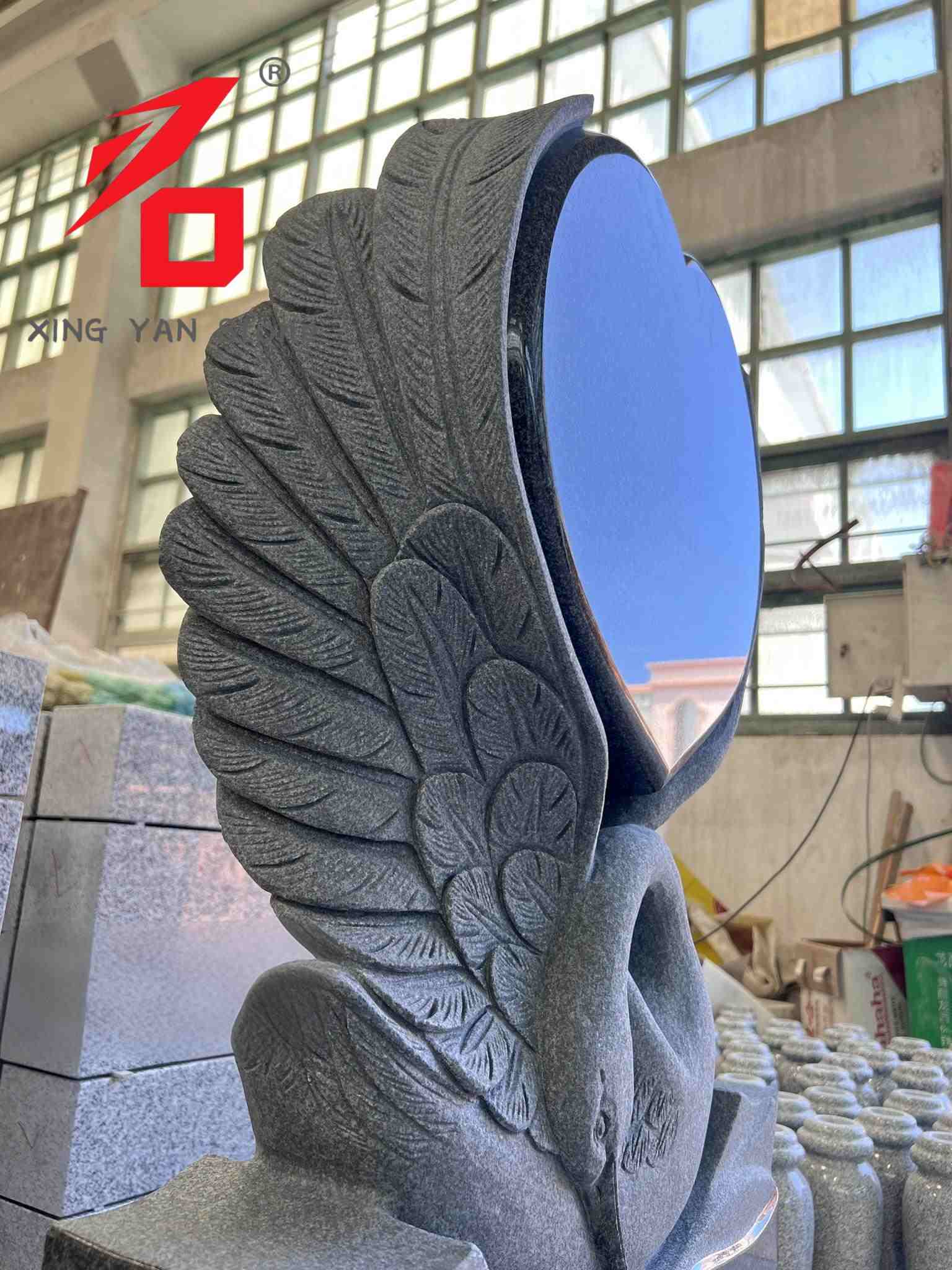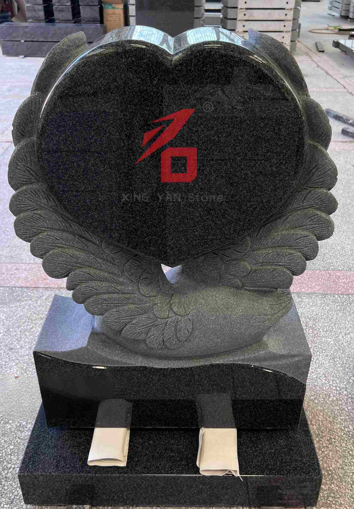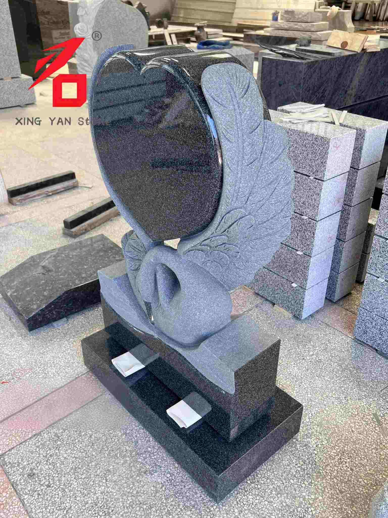 डिझाईन: मुख्य भाग एक पॉलिश काळे हृदय आहे, त्याच्या मागे सजीव हंस पंख कोरलेले आहेत. हंस आकार आणि हृदय मृत व्यक्तीसाठी चिरंतन प्रेम आणि स्मरण यांचे प्रतीक आहे. एकूणच रचना अत्यंत कलात्मक आहे, ती पारंपारिक समाधी दगडांच्या नीरस शैलीपासून वेगळी आहे.